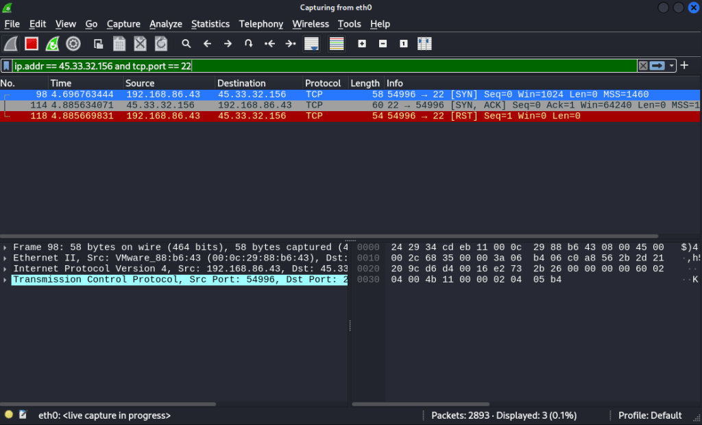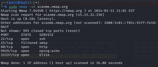 However, many modern intrusion detection systems and firewalls are well equipped to detect SYN scans like this, so the stealth scan title isn’t as applicable in modern times. Even equipped with a packet analysis tool like wireshark, SYN scans can be identified quite easily if you know what to look for.