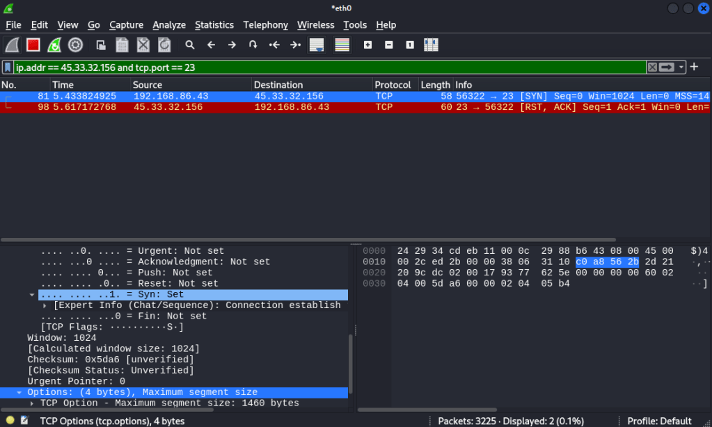 Nmap determined port 23 as closed, so when we change our filter in wireshark to investigate traffic going to port 23 on that device, we can see why. The initial SYN packet is simply met with a RST/ACK packet from the target, indicating the port is closed. No further data can be transmitted to that port, since the target device will not accept connections on it.
