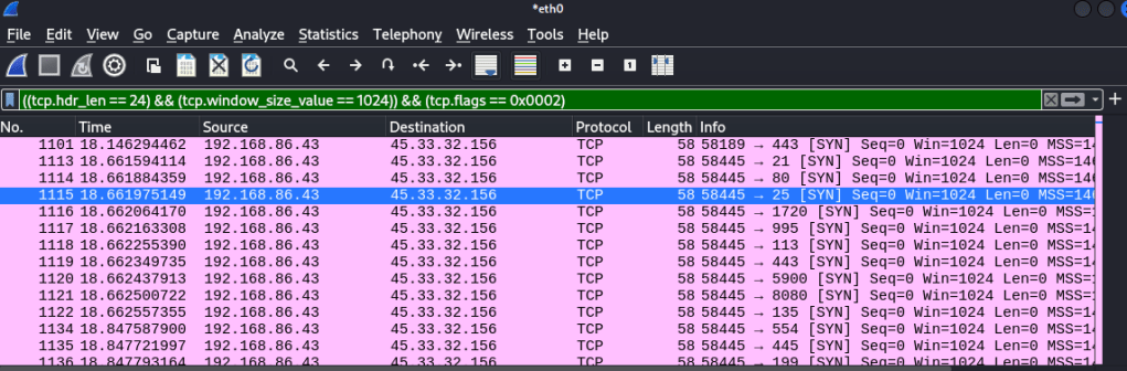 However, while this may catch someone running a basic SYN scan, malicious actors are always capable of creating new ways of bypassing detection. They could use a different scan that flies under the current detection rule, or edit the values in the SYN packet so the header length is different, resulting in bypassing our previously created filtering rule.