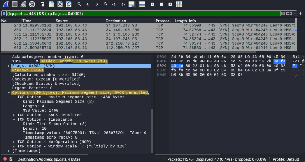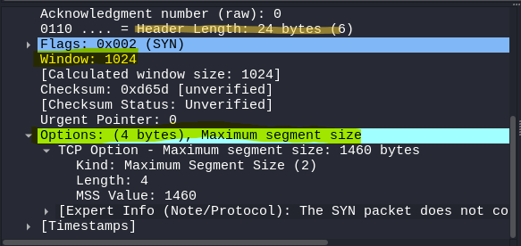 This is where our mentality shifts to a blue team mindset, aiming to identify if a scan is taking place against our network or devices. By delving into the details of the initial SYN packets sent by nmap, we can identify some key pieces of data that help us to identify if someone is performing a basic SYN scan against our devices. The pieces of data are the window size and the options field, which then in turn impacts the header length of the packet. All this is highlighted in yellow below: